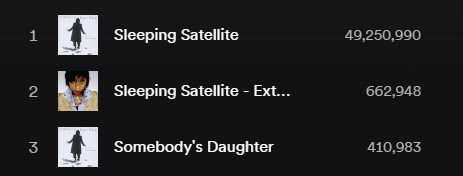 AWOOSHs: Artists With One Outsized Signature Hit. It feels unfair to call these people one-hit wonders, because they often have a substantial catalogue with a smattering of modest hits. It’s just that one of their songs was massively more successful than the others. Tasmin Archer is a good example of an AWOOSH. You can see in her Spotify stats that her big hit absolutely eclipses everything else she’s done: